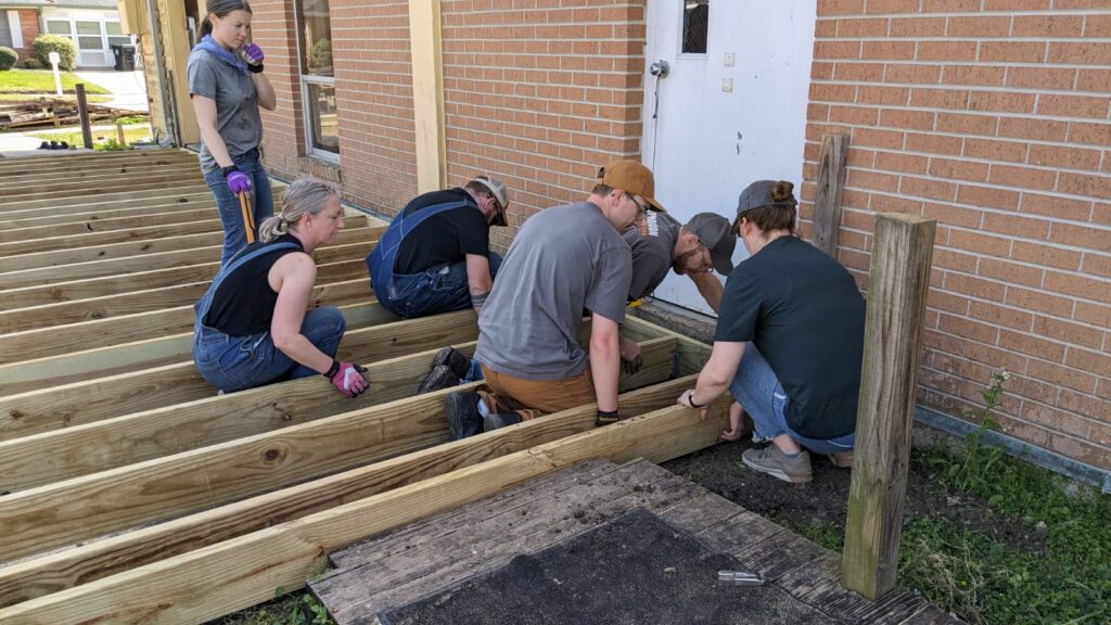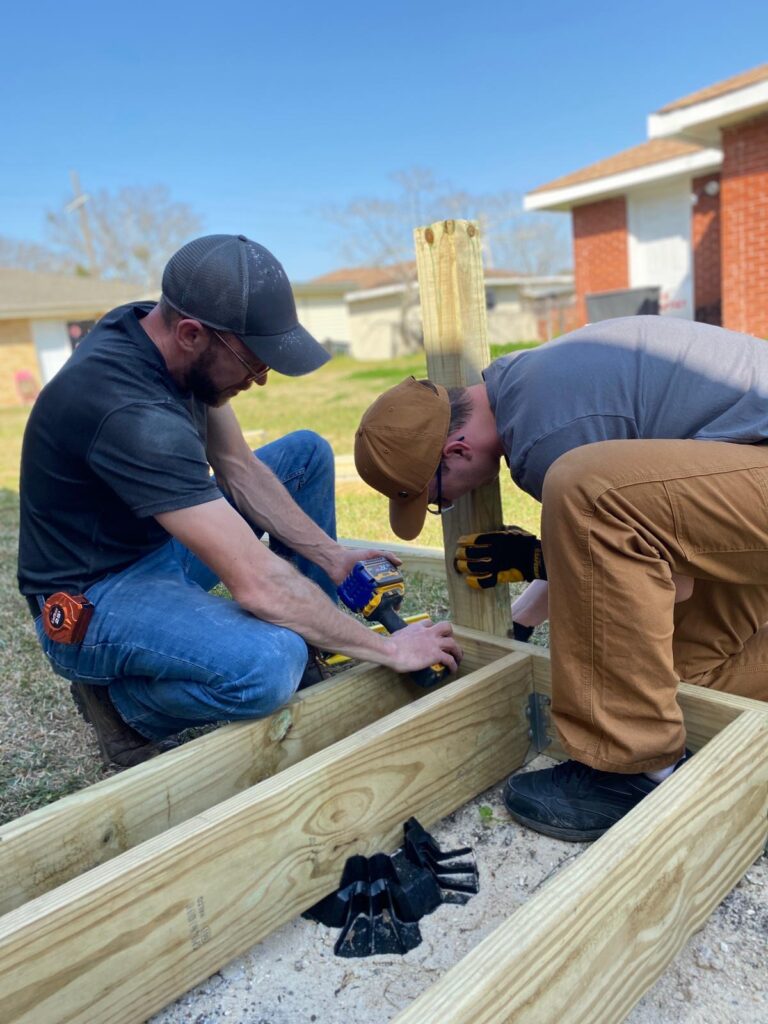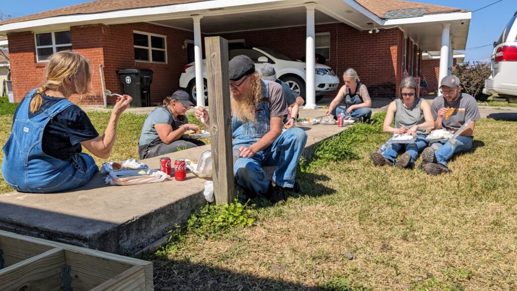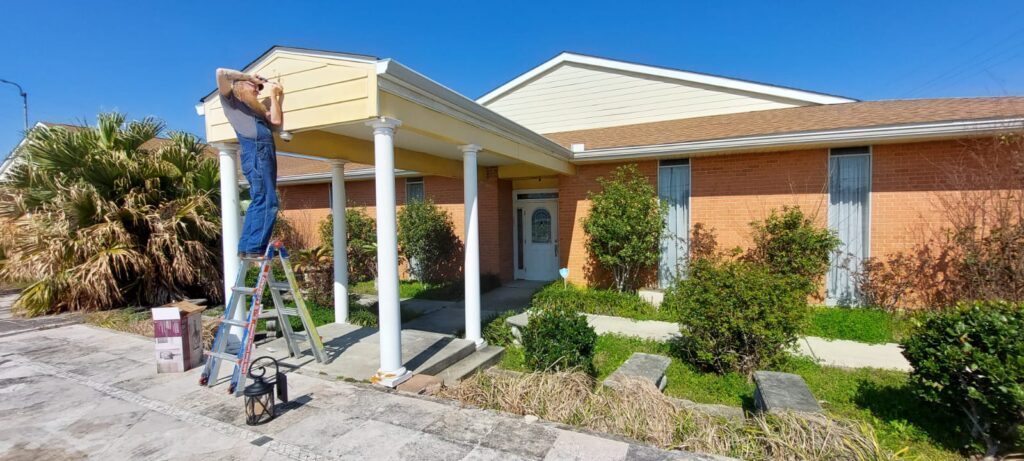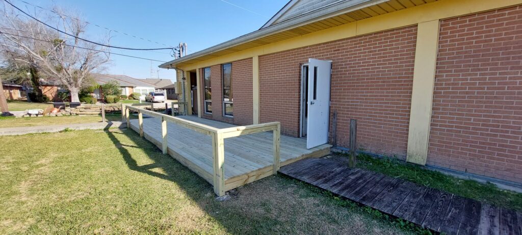 Greetings from NOLA! The new church sign is up and looks great from the highway. We were able, with a mighty team push, to slide the deck foundation into place. Entering into our last work day we were able to complete work on the deck, patching up the parking lot, website launch and work in one of bathrooms.