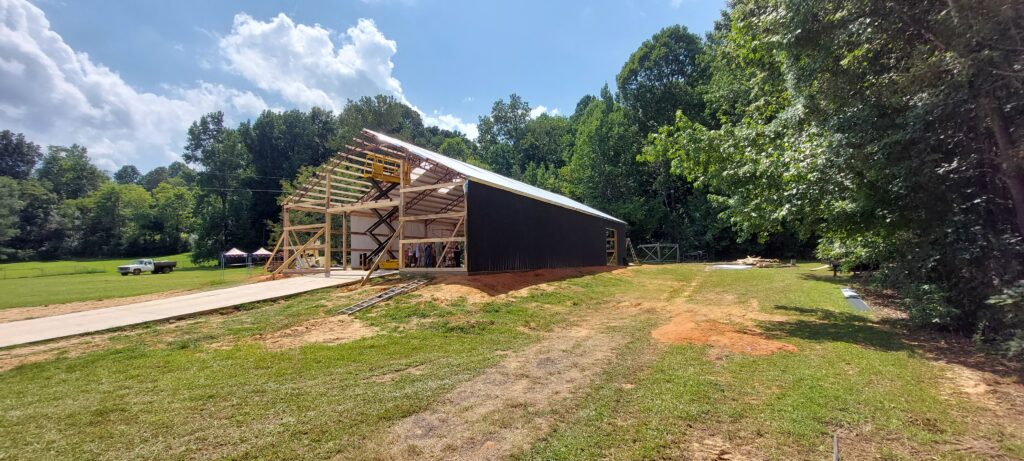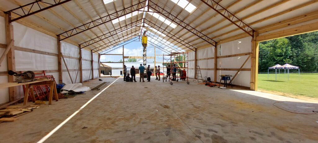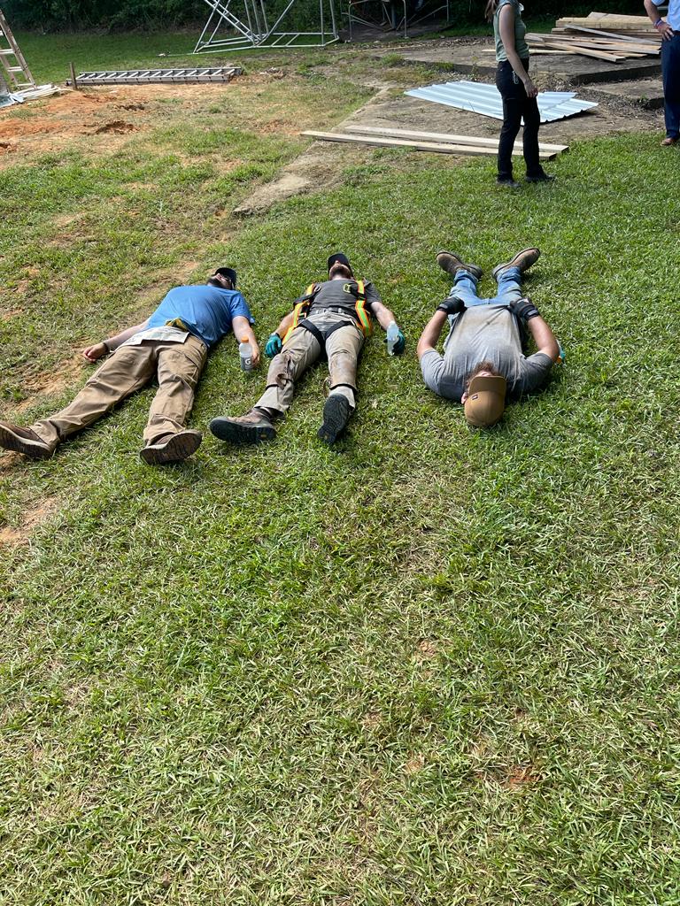 Team #1 started putting insulation and metal on the roof last week. After some tinkering they came up with a good system to use… As you would expect, working on a tin roof in Mississippi in mid-summer is HOT!!!